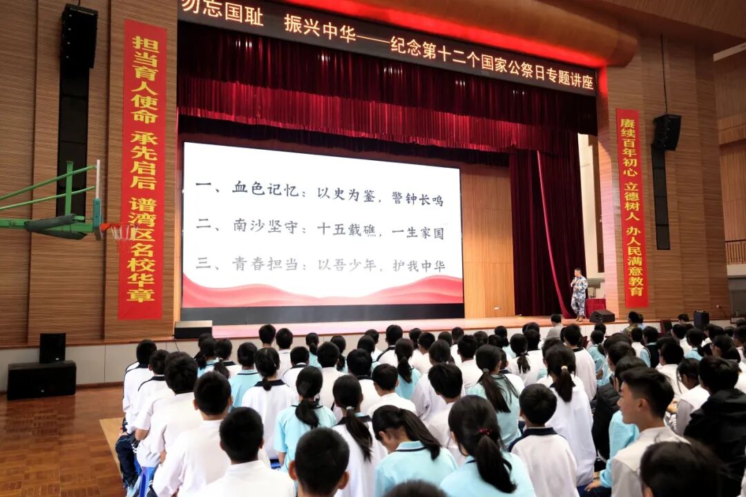 活動邀請中山港口鎮人民武裝部副部長賀洪彪以《銘記歷史守海疆 青春立志報家國》為題開展專題講座,帶領師生重溫南京大屠殺那段山河破碎的屈辱歷史,闡釋國家公祭日的設立意義,讓師生深刻理解“銘記歷史、勿忘國恥”的意義。現場莊嚴肅穆,全體師生為南京大屠殺死難同胞默哀,用無聲的敬意寄托對逝者的哀思。 會上,賀洪彪結合自身十五載南沙守礁經歷,講述“以礁為家、以苦為榮”的崢嶸歲月,用軍人的忠誠與信仰,詮釋新時代國防衛士守護家國的責任擔當,讓師生們真切感受到和平生活的來之不易。