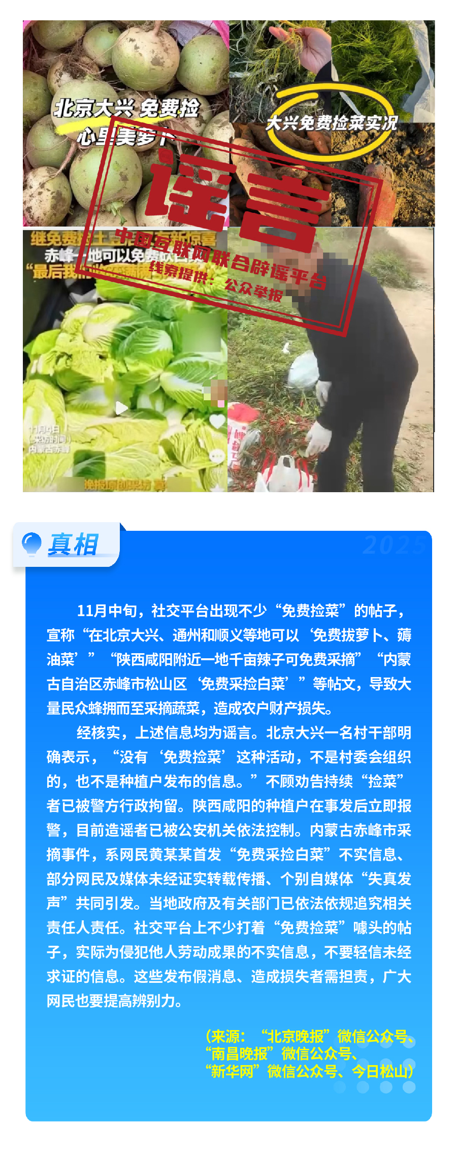 此外,“免費(fèi)撿菜”傳言在多地蔓延,北京大興、內(nèi)蒙古赤峰、陜西咸陽(yáng)等地,均有群眾因不實(shí)信息誤導(dǎo)涌入農(nóng)田哄搶,導(dǎo)致農(nóng)戶財(cái)產(chǎn)受損;“充‘劣質(zhì)電’會(huì)導(dǎo)致新能源汽車自燃”的說法,毫無科學(xué)依據(jù),實(shí)為造謠者為博流量惡搞。另有“高見觀潮”“象視汽車”“987瘋狂奶爸”等賬號(hào)在多平臺(tái)編發(fā)涉汽車行業(yè)的虛假信息,惡意抹黑詆毀汽車企業(yè)、汽車產(chǎn)品,損害汽車行業(yè)發(fā)展形象。