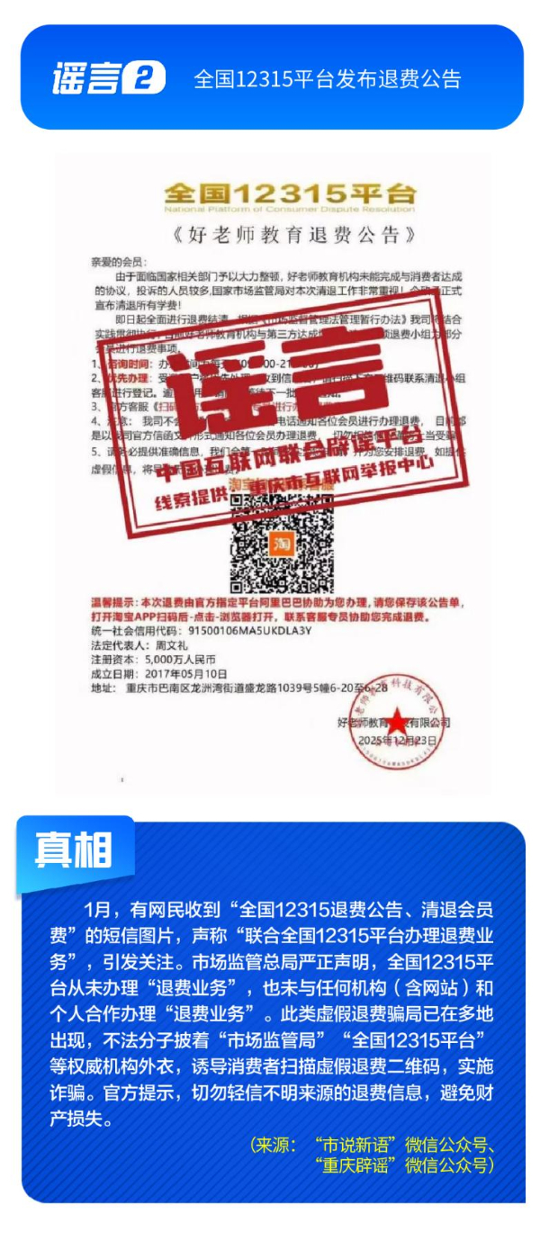 公共政策領(lǐng)域謠言誤導(dǎo)公眾決策。“社保卡沒有有效期限制、未到期不能換新卡”是對社保卡管理政策的誤讀,給民眾平添困擾;“28家博物館元旦期間閉館”實(shí)為少數(shù)博物館根據(jù)運(yùn)營安排所做的微調(diào),網(wǎng)帖嚴(yán)重夸大實(shí)際閉館情況,引發(fā)負(fù)面炒作;“深圳有望推行12年義務(wù)教育,高中免費(fèi)”是對現(xiàn)行政策的“超前編造”,誤導(dǎo)學(xué)生及家長群體;“全國12315平臺發(fā)布退費(fèi)公告”,則是假冒監(jiān)管機(jī)構(gòu)名義散播不實(shí)通知,為后續(xù)詐騙行為做鋪墊。
