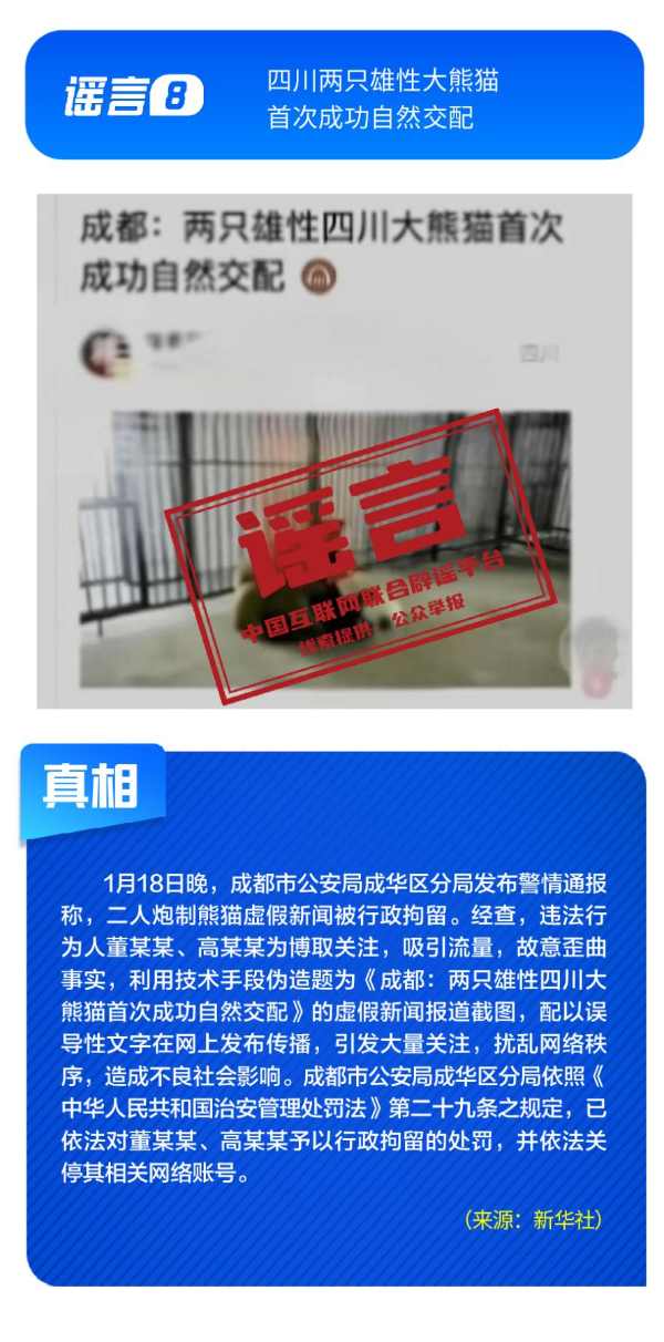 健康與科普領(lǐng)域謠言違背客觀規(guī)律。“人血白蛋白是‘增加免疫力’的法寶”刻意夸大該處方藥的臨床用途,忽略其特定醫(yī)療場景與使用風(fēng)險(xiǎn);所謂“大棚草莓、冷庫葡萄、進(jìn)口車?yán)遄印⑷旧疤情偈嵌焖缢拇蠖就酢敝{言片面解讀農(nóng)產(chǎn)品種植與保鮮方式,缺乏科學(xué)依據(jù);“四川兩只雄性大熊貓首次成功自然交配”純屬為吸引流量而捏造的獵奇內(nèi)容,其視頻畫面為AI生成;“2026年8月12日地球?qū)⑹ヒΓ瑢?dǎo)致6000萬人死亡”更是無中生有的荒謬謠言。