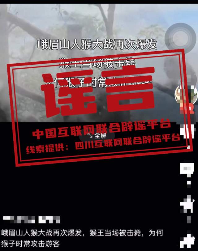 詳情:近日,有關“峨眉山人猴大戰再次爆發,猴王當場被擊斃”的消息在網絡上傳播,引發社會關注。經核實,該消息為謠言。網傳視頻是將多地畫面進行剪輯拼接而成,AI生成痕跡較重,且視頻中被擊斃的“猴王”并不是峨眉山藏酋猴。實際上,“峨眉山人猴大戰猴王被斃”的謠言多年前曾出現,當時景區已經聯合森林公安等部門共同辟謠。(來源:四川互聯網舉報辟謠平臺)